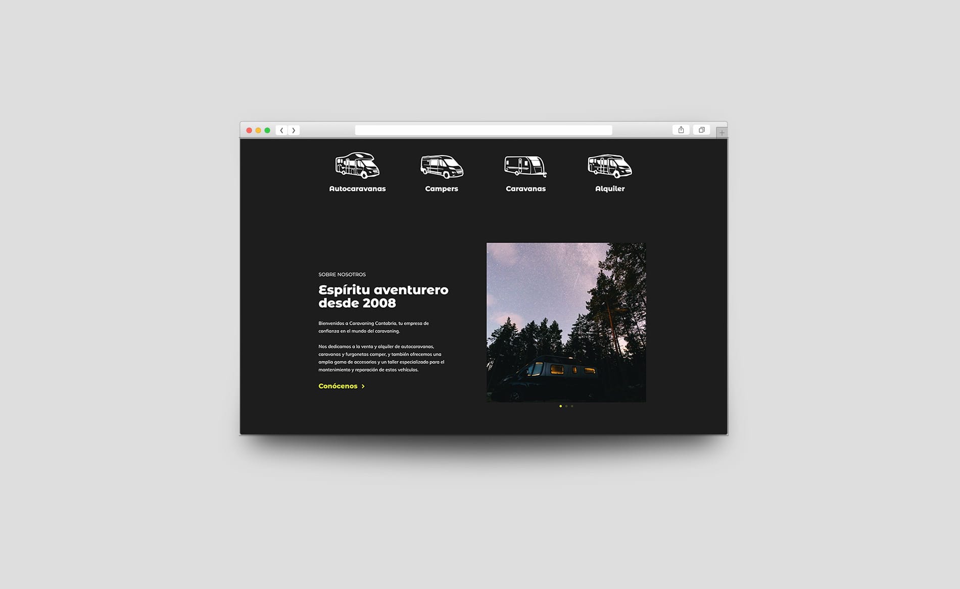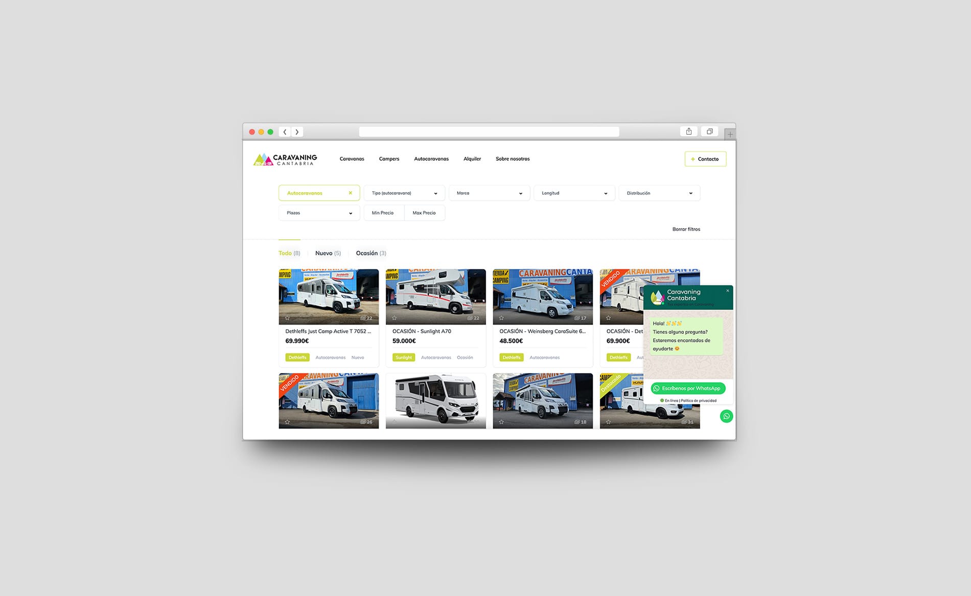 Hemos colaborado con Caravaning Cantabria, una empresa familiar especializada en la venta y alquiler de autocaravanas, caravanas y furgonetas camper. Desarrollamos una plataforma intuitiva que les permite listar sus vehículos de manera clara y accesible, facilitando a sus clientes potenciales toda la información que necesitan para tomar decisiones. La plataforma ofrece una experiencia de usuario intuitiva y atractiva, alineada con la estética y los valores de la marca.